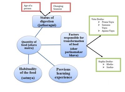 The proper quantity of food depends on the strength of agni ( factors responsible for digestion and metabolism). The strength of agni varies according to season, age and other factors. Thus the amount of food will also vary as per the power of agni. The suitable variation in quantity of food helps maintaining proper digestion and metabolism. The quantity further subjects to heavy to digest (gurutva) and light to digest (laghutva) nature of food.