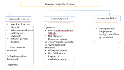 Vitiation of all the three doshas during pregnancy is the ultimate cause of congenital disorders. [A. H. Sharira Sthana 1/6] Among them vata is having the main role as it is the controller of all kind of activities and especially the anatomical formation (akruti)of embryo(garbha) is brought out by vayu[Cha. Sa. Sutra sthana 12/8], [Su. Sa. Sharira Sthana 2/50-52]