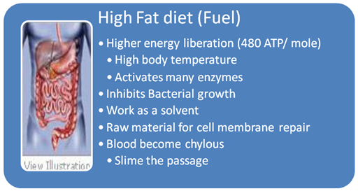 - Use of fats as a high energy substance-Oils and fats yield 9 KCal energy in contrast to 4.5 Kcal from carbohydrates and proteins, which could be expended as a substitute or replacement source of energy during purification procedure.