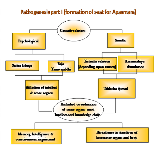 Causative factors of apasmara can be categorized under dietary, lifestyle, psychological and iatrogenic factors. Vitiated doshas get through the vessels of the heart and when exposed to predisposing psychological factors like excess worry, grief, anger, and fear, move upwards from the heart, the abode of all consciousness, to the brain, afflicting the senses while altering memory. This eventually leads to apasmara. The etiology of the disease and specific features of the dominant doshas involved, and nidanarthakara roga (one disease causing other disease) and its importance in diagnosis and treatment have been described in detail in this chapter, with some important aspects of diagnosis addressed. In some cases, both diseases (the causative and the secondary ones) coexist while in other cases, the causative disease disappears and the new disease remains present. Thus, this chapter, while focusing on apasmara, also talks of complications that lead to secondary conditions and their treatment.