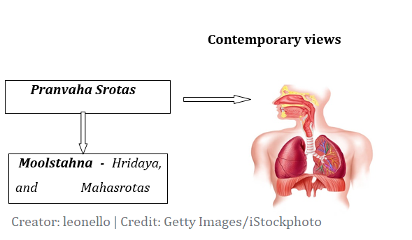 Pranavaha srotas can be co-related with the respiratory system. It starts from the nostrils to nasal chambers, pharynx, trachea, bronchi, bronchioles, and finally to the alveolar sac, where the capillaries and veins surround it. The exchange of respiratory gases between lungs and blood takes place diffusion across alveolar and capillary walls. This process is totally passive; no ATP is required for this process. The gaseous exchange occurs in cardio-pulmonary circulation through the pulmonary veins and arteries. The oxygenated blood is then circulated to the body by the heart through the cardiovascular system. The oxygenated blood runs to the organs, then to tissues and cells. There, the exchange of oxygen and carbon dioxides occurs through the cellular pathways. The deoxygenated blood returns to the heart via veins. The same goes back to the lungs to get oxygen.reference needed This full path is included in pranavaha dhamani. In this whole process of cardio-pulmonary circulation, the heart plays a significant role. So, ayurveda scholars describe it as a site of origin for pranavaha srotas.