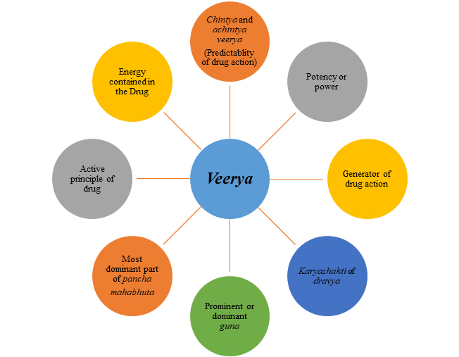 Veerya (also spelled as Virya) means potency or active components. The ayurvedic pharmacological principles include five factors, viz. rasa (taste), guna (qualities), veerya (potency), vipaka (post-digestive effect), and prabhava (significant effect). These are commonly known as rasa-panchaka or dravyagat pancha padartha.[1] Veerya is one of the crucial factors in constituting the pharmacology of drug. In pharmacology, as per Ayurveda, the word Veerya [SAT Code- F.22] is envisaged as the potential factor of the drug by which it performs specific actions in the body. This broad term is employed to explain lesser or greater potential drug factors concerning different processes and procedures to achieve the desired effect in the body.[2]
